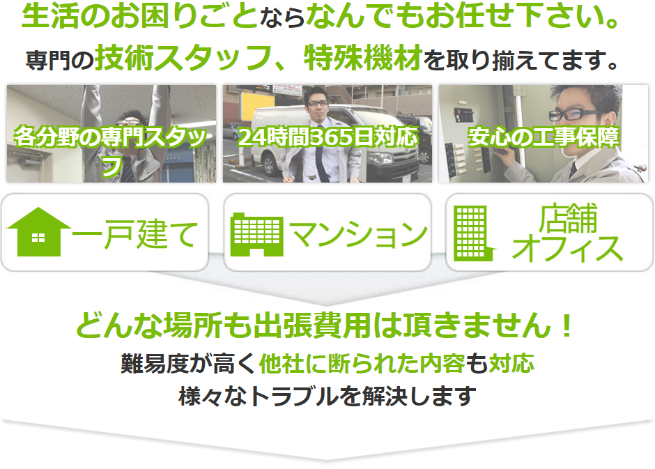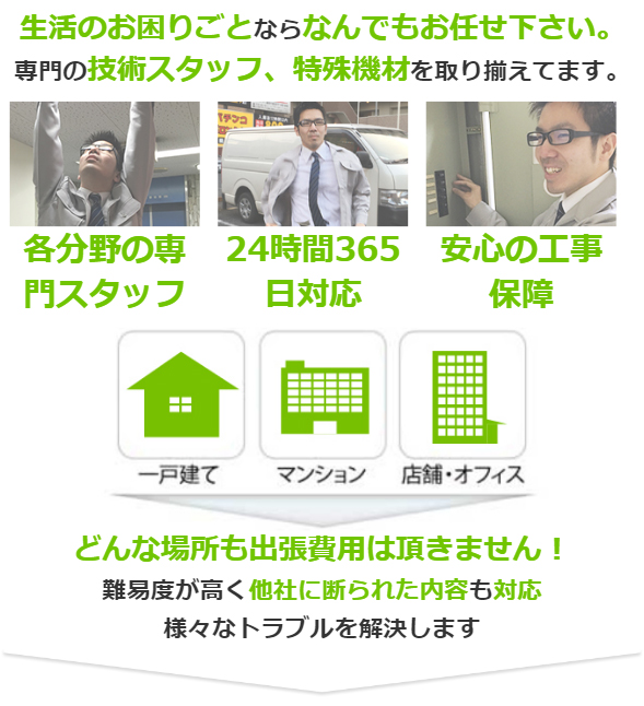 日本全国に対応しております。全国各地に、拠点を設けておりますので、 現場まで急行出来るような仕組みを整えております。